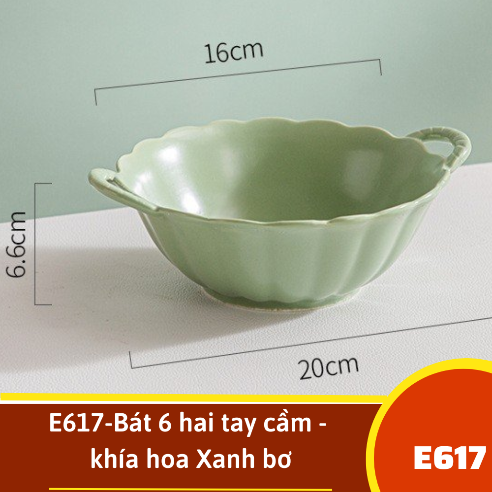 E617-Bát 6 hai tay cầm - khía hoa Xanh bơ