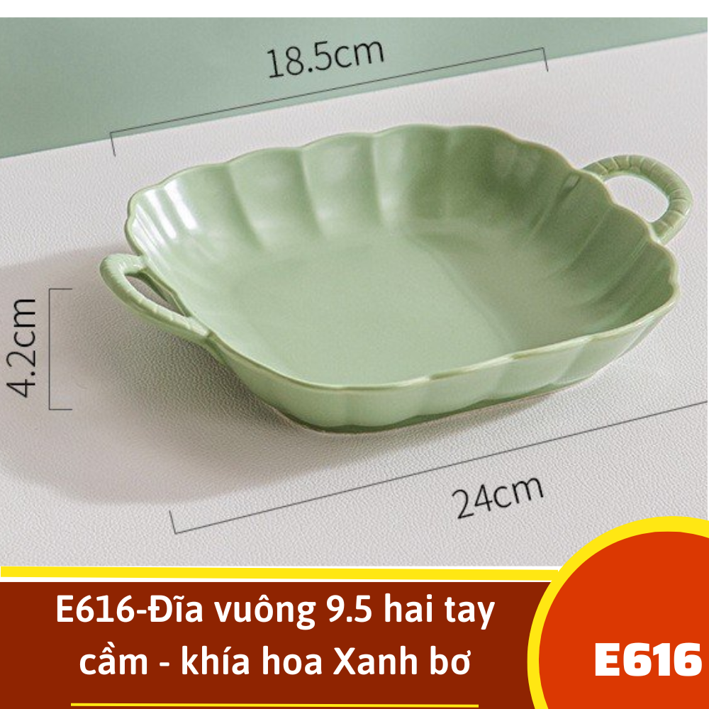 E616-Đĩa vuông 9.5 hai tay cầm - khía hoa Xanh bơ